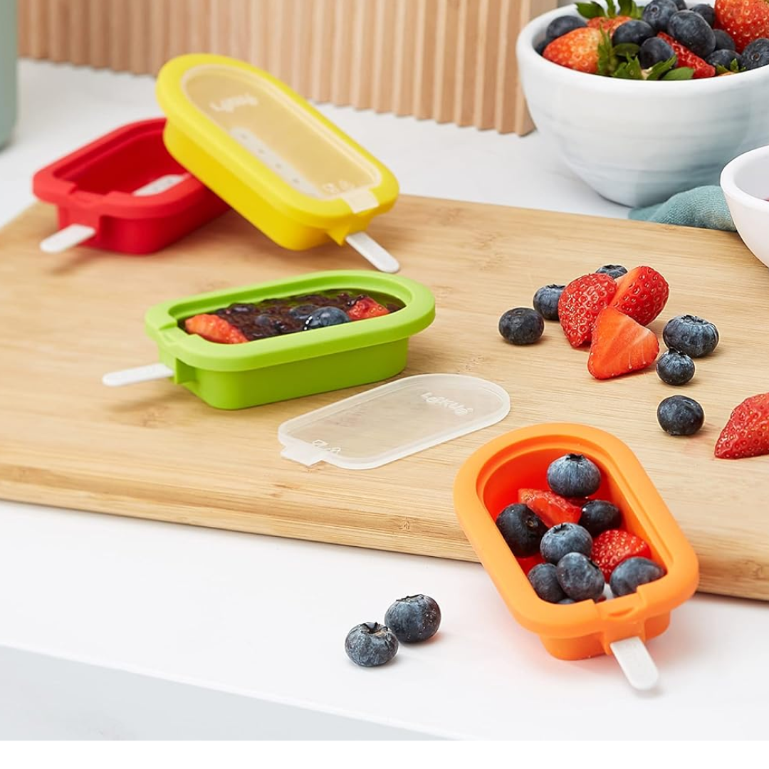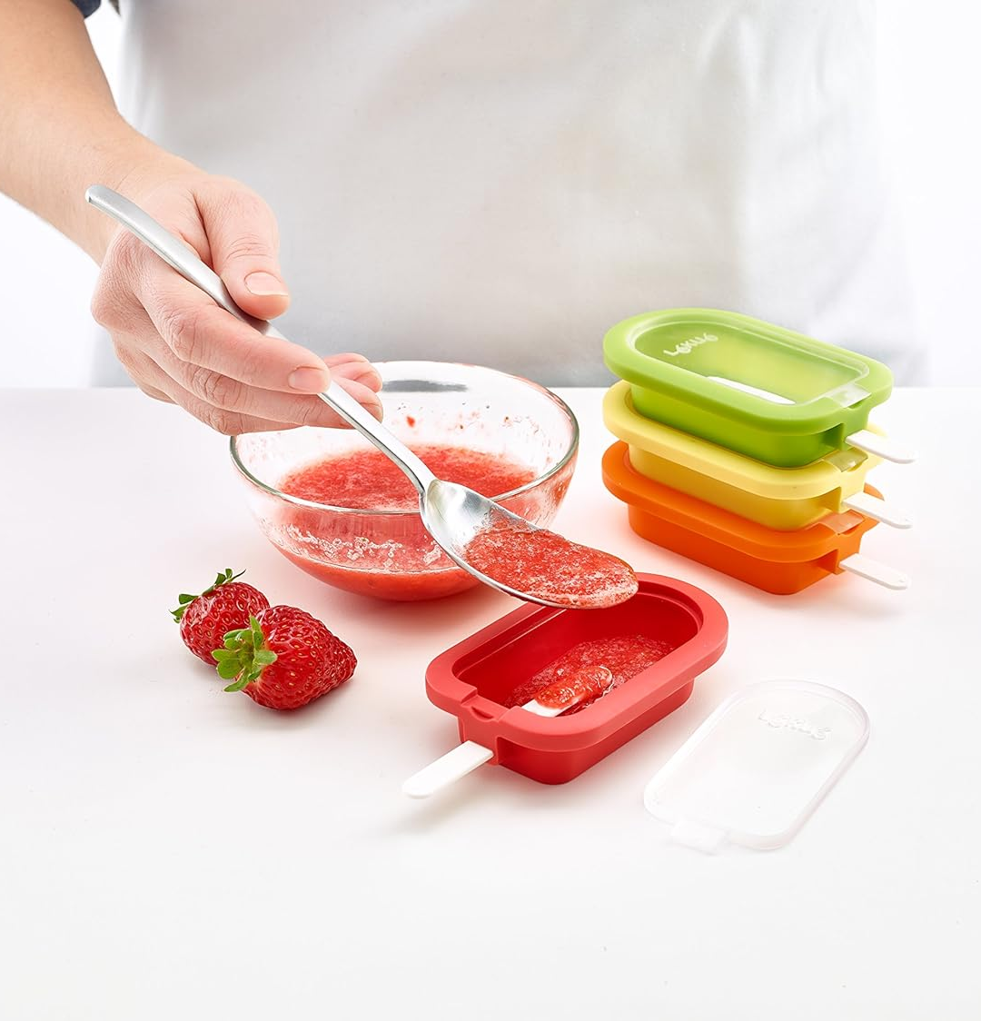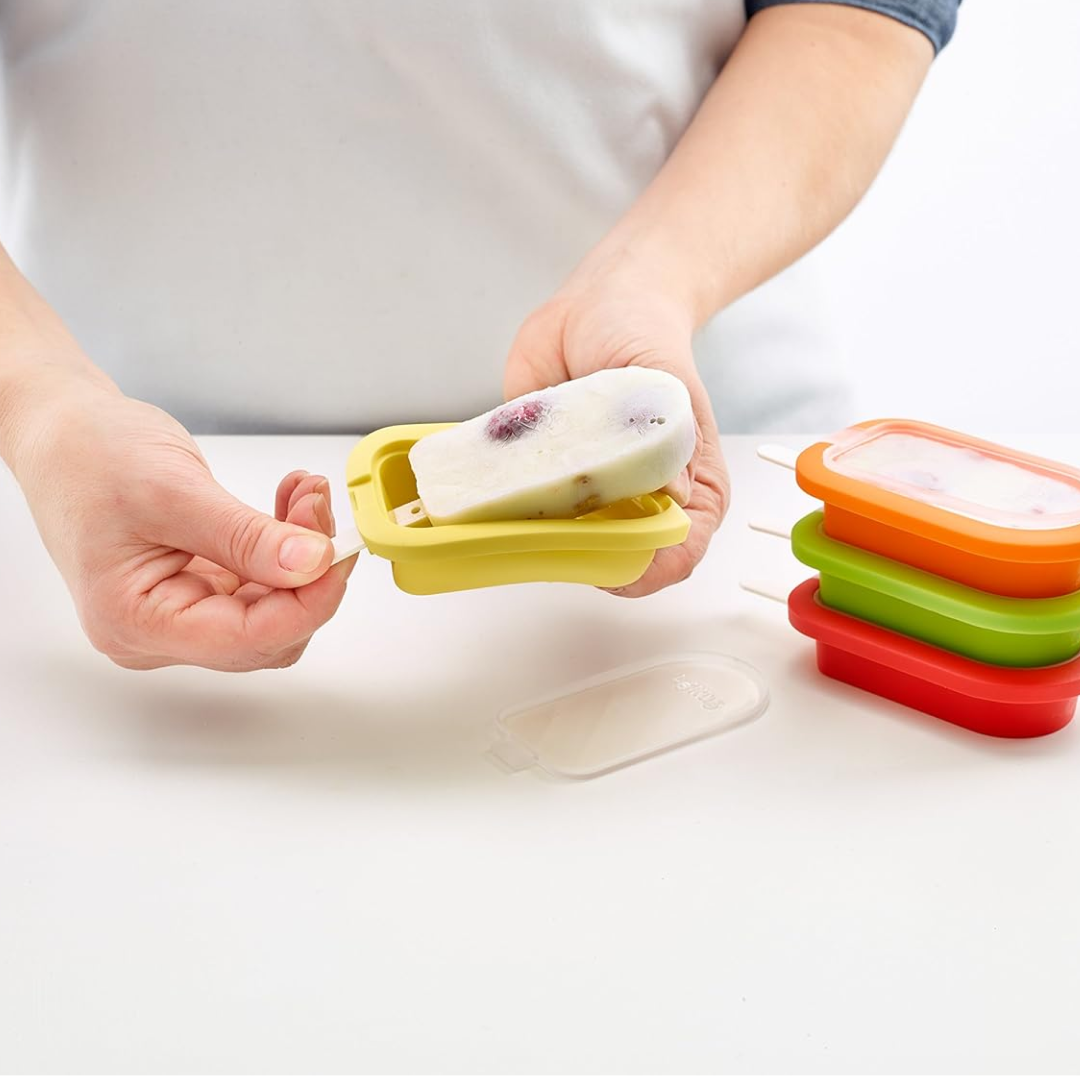 Prepará helados caseros de forma fácil, rápida y natural con este kit de 4 moldes. Su diseño de rellenado horizontal es estable y seguro, ideal para que los chicos también participen en la preparación. Cada molde incluye tapa protectora, que evita la mezcla de olores y permite apilarlos para ahorrar espacio en el congelador.