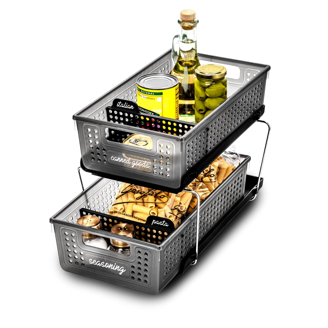 Organizador de dos niveles con divisores. Es ideal para usarlo en las alacenas o debajo de la mesada de la cocina. Los cajones te ayudan a ordenar y organizar toda su casa con facilidad, a la vez que los divisores interiores separan aún más todos tus elementos esenciales.