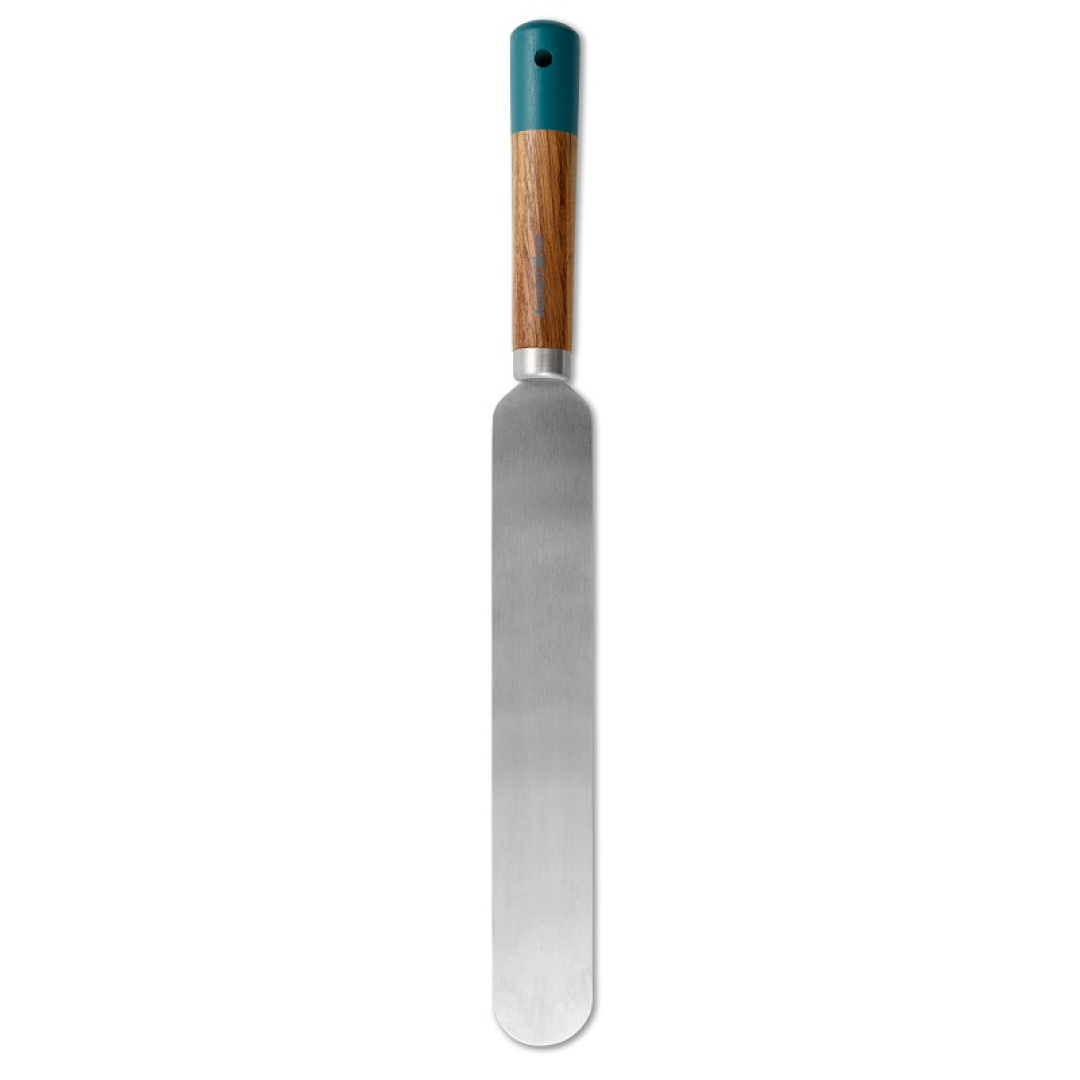 Espátula diseñada con una hoja flexible que la hace perfecta para los trabajos más delicados y precisos, tales como untar y recortar glaseado, levantar productos horneados y crear efectos en coberturas. Tiene un elegante mango de madera de acacia templada.