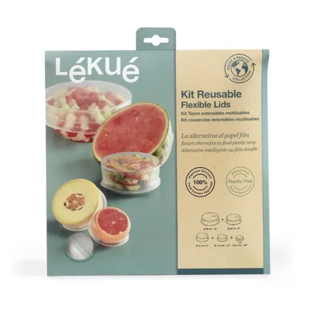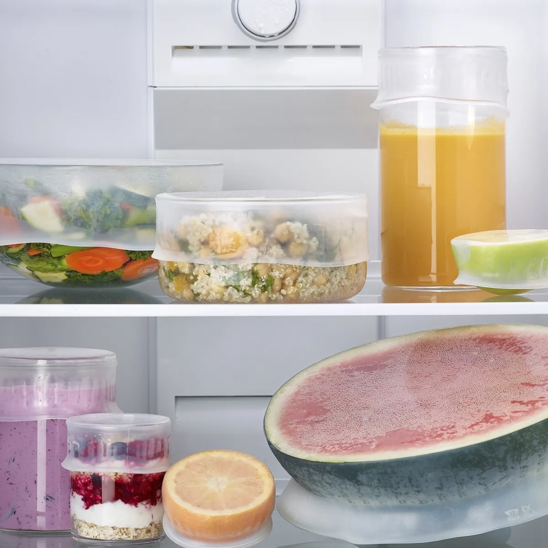 Kit de 6 tapas extensibles reutilizables de 100% silicona que permiten conservar herméticamente los alimentos en la heladera. Las tapas evitan la contaminación de olores y conservan la frescura de la comida.