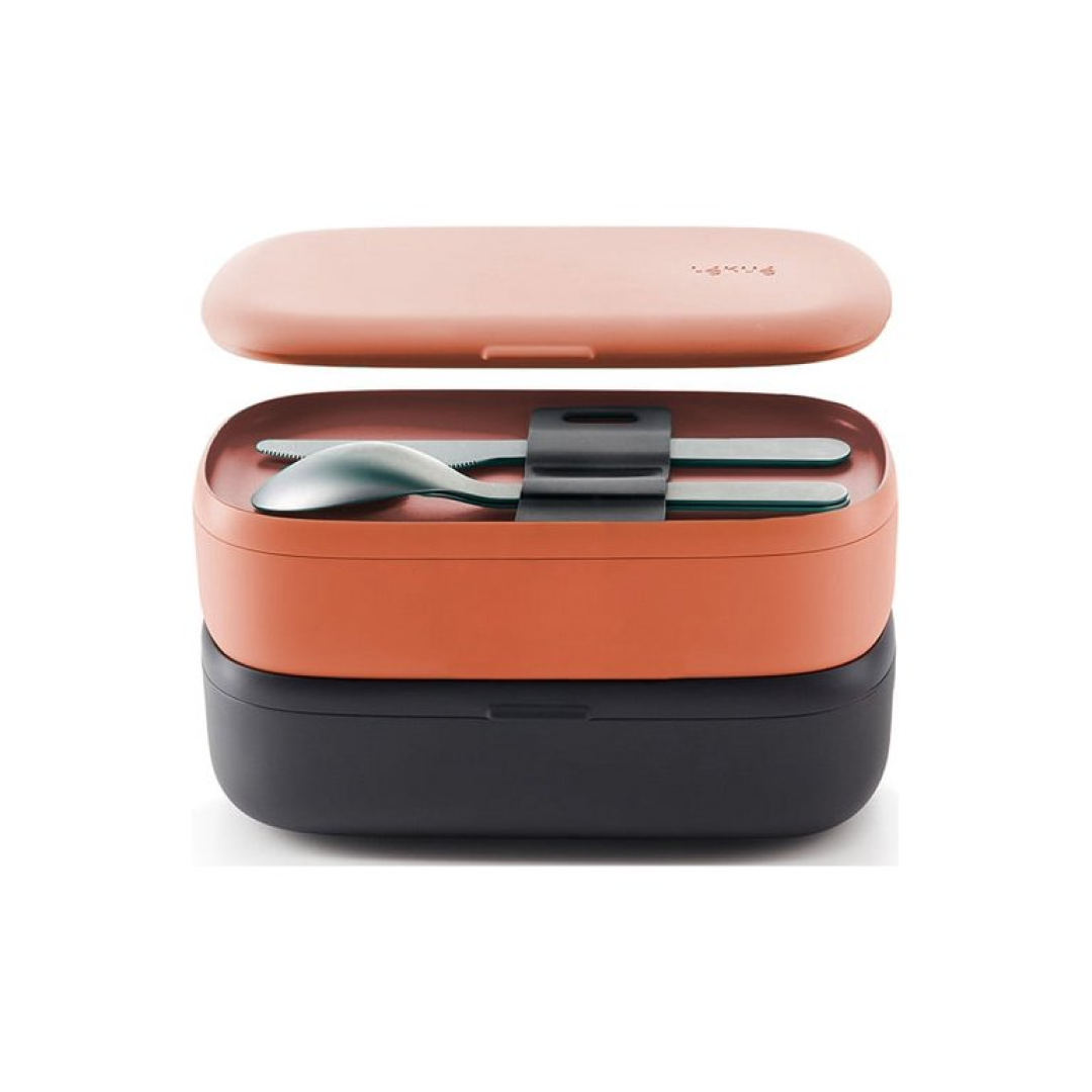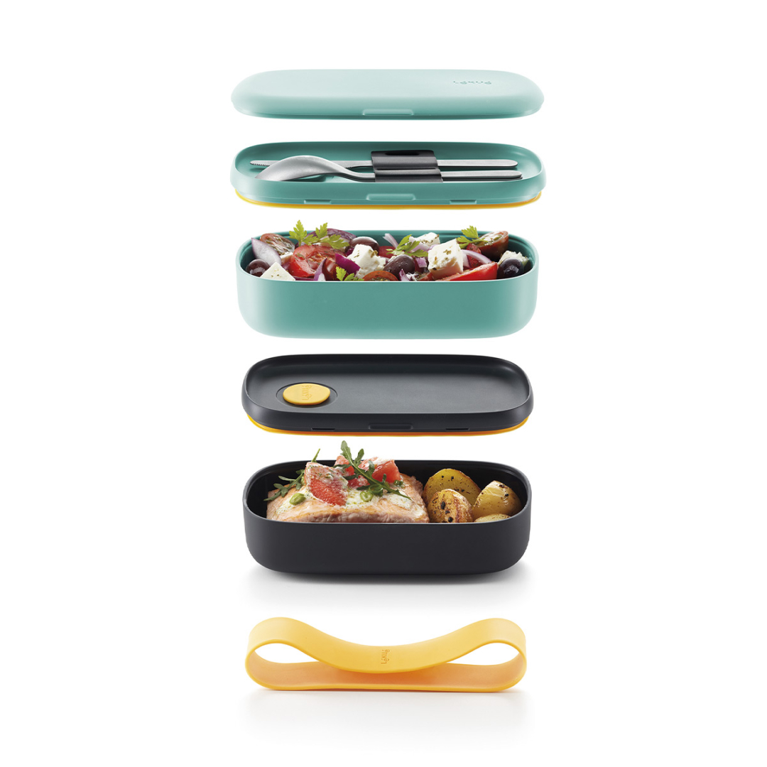 El LunchBox To Go te permite disfrutar de tus platos favoritos donde estés gracias. Incluye dos compartimentos de 500 ml cada uno, que se encastran entre sí y se mantienen firmemente unidos mediante una banda de silicona.
