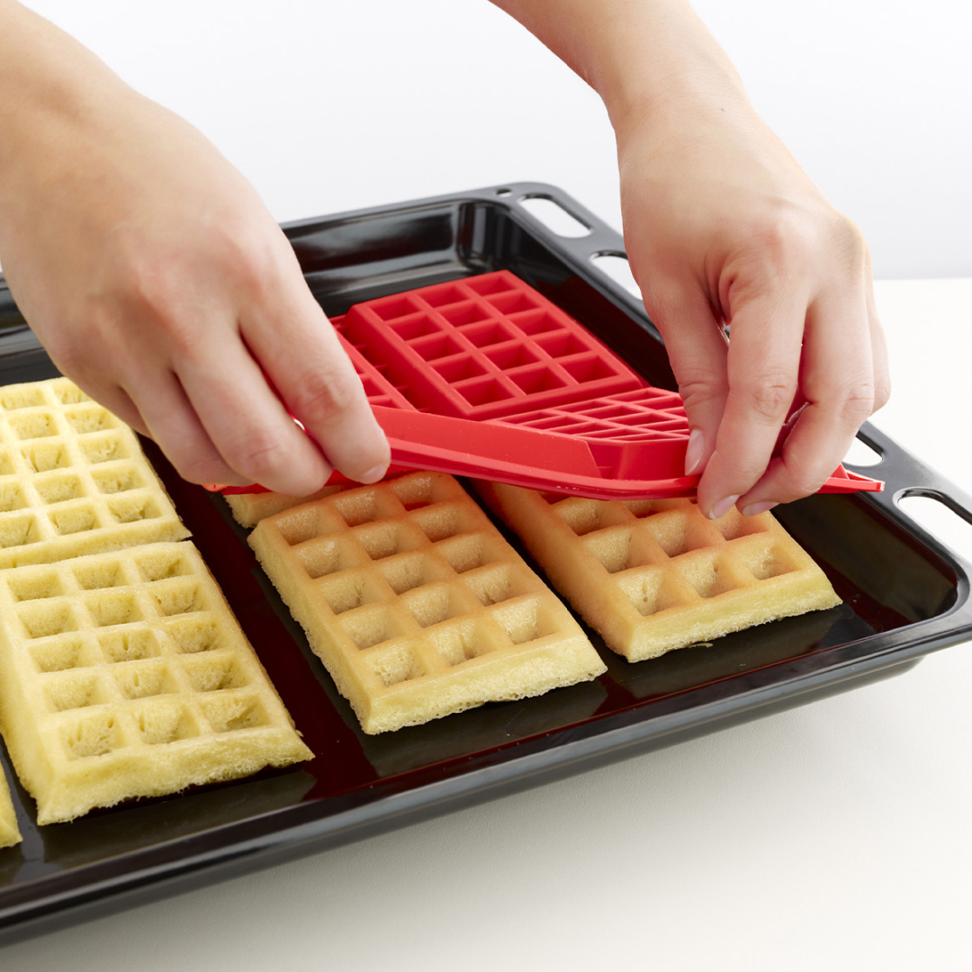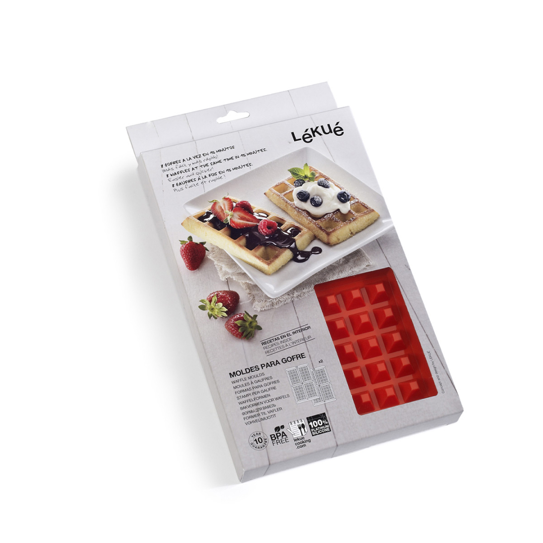 Set de 2 moldes de silicona para hornear 8 waffles a la vez en tan solo 15 minutos. Rellená el molde con la masa en el molde, llevalo al horno y decorá los waffles para servir. Son fáciles de desmoldar. Fabricados 100% en silicona, son antiadherentes y ocupan poco espacio.