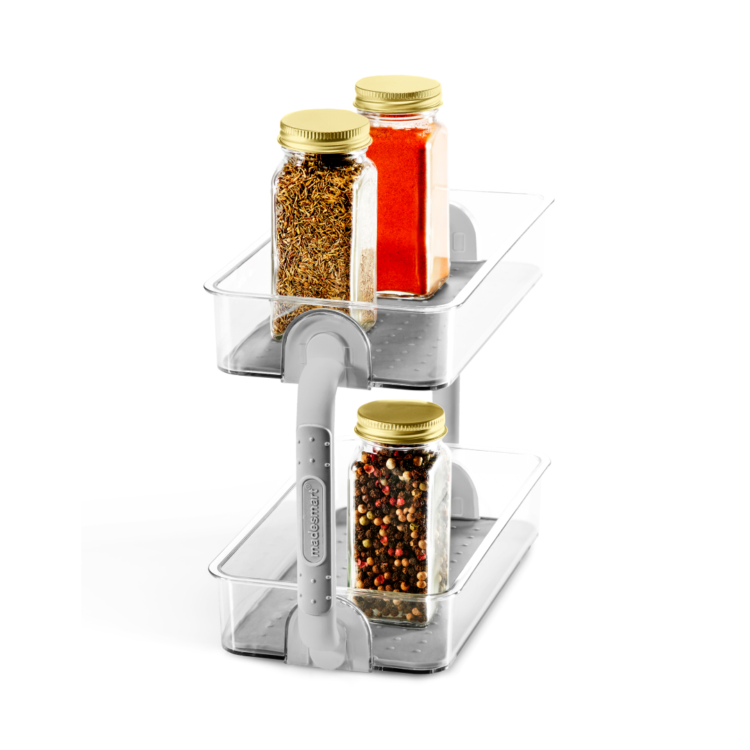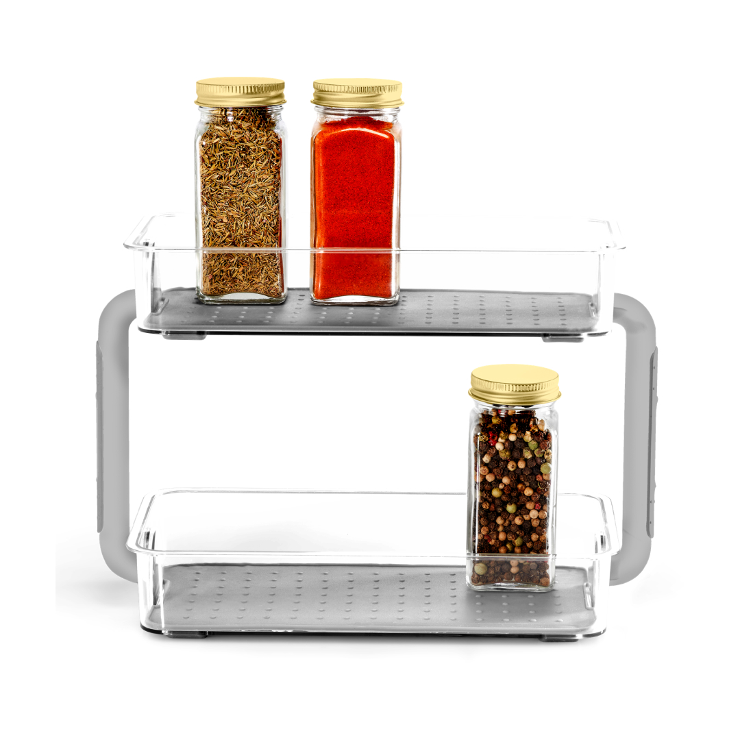 El organizador de especias de dos niveles maximiza el espacio vertical en tus alacenas. Tiene el tamaño perfecto para caber en los gabinetes superiores para un mejor almacenamiento.