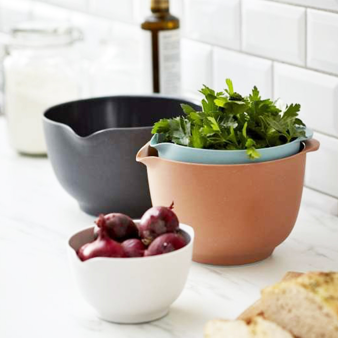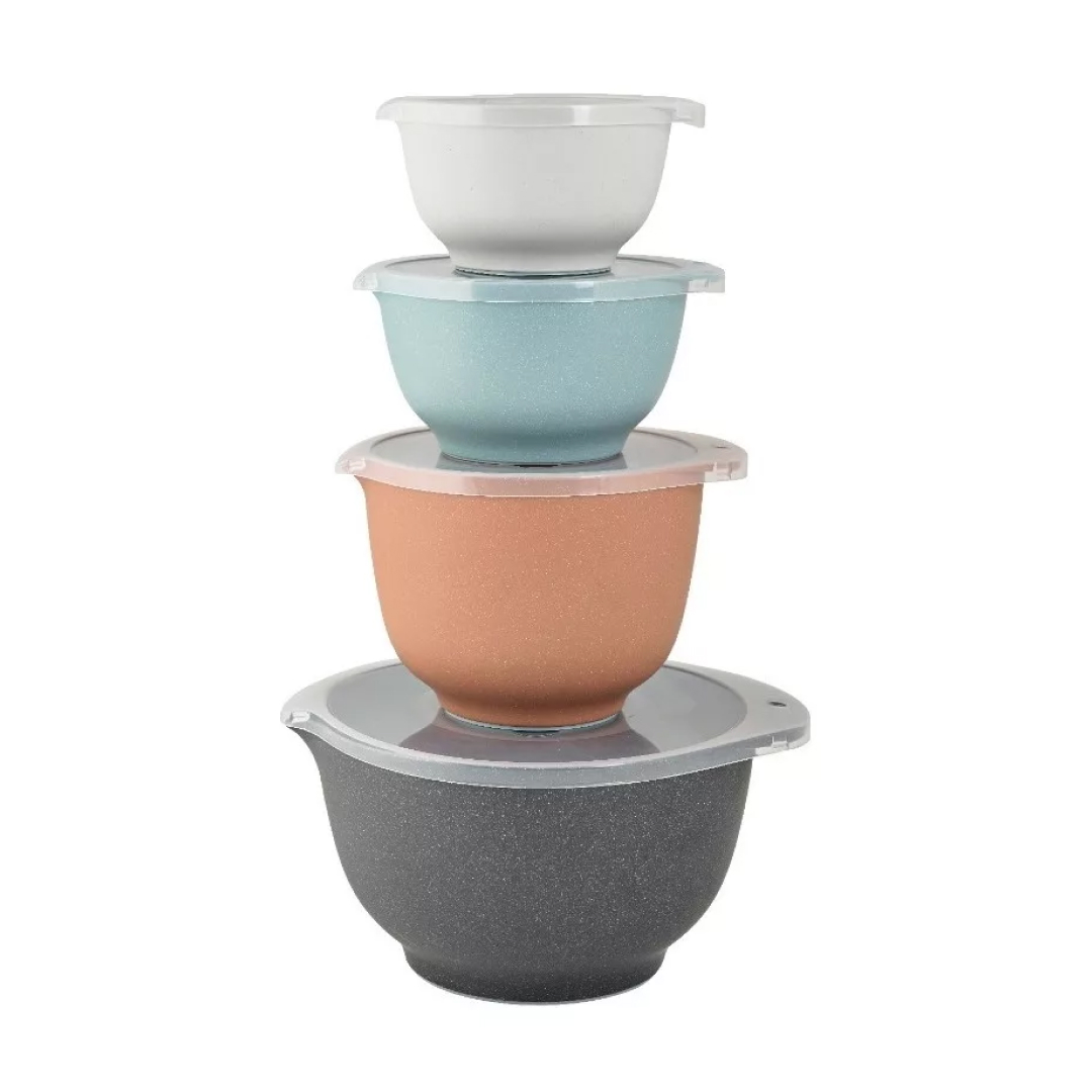 Set de 4 bowls Margrethe de melamina con capacidad de 500ml, 750ml, 1,5L y 3L con tapa de polipropileno. Además tienen base anti-deslizante, pico vertedor y asa para mejor agarre que mantiene el recipiente firme mientras mezclás o batís.