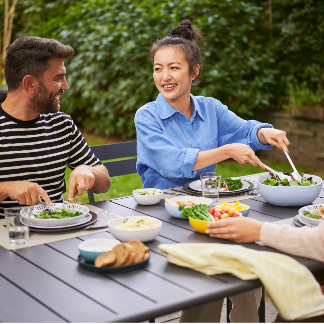 Juego de cuchara grande y tenedor para ensaladas de la línea Synthesis. Combina perfectamente con la ensaladera de 4 L. Son resistentes al calor hasta 70 °C y no tienen bordes afilados.