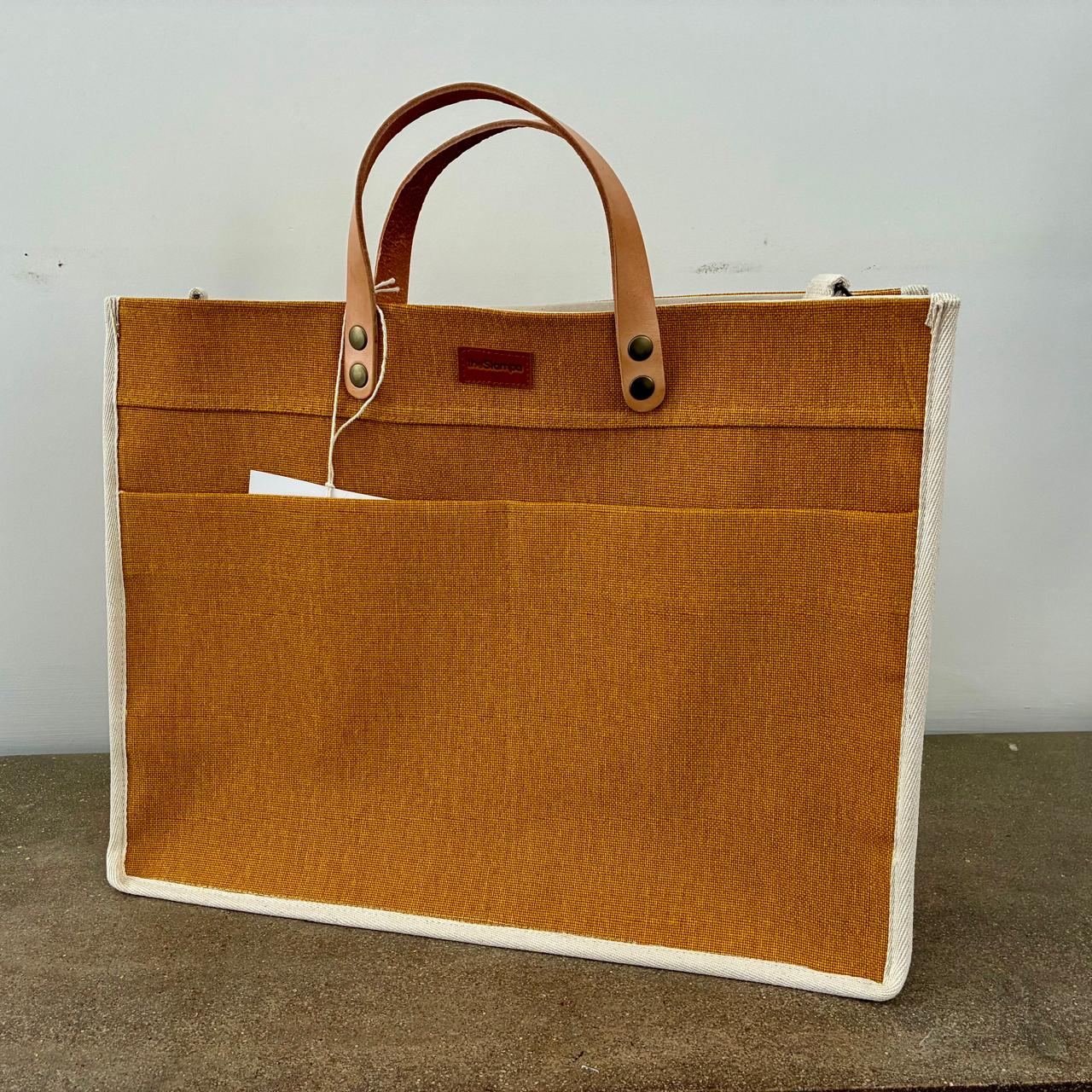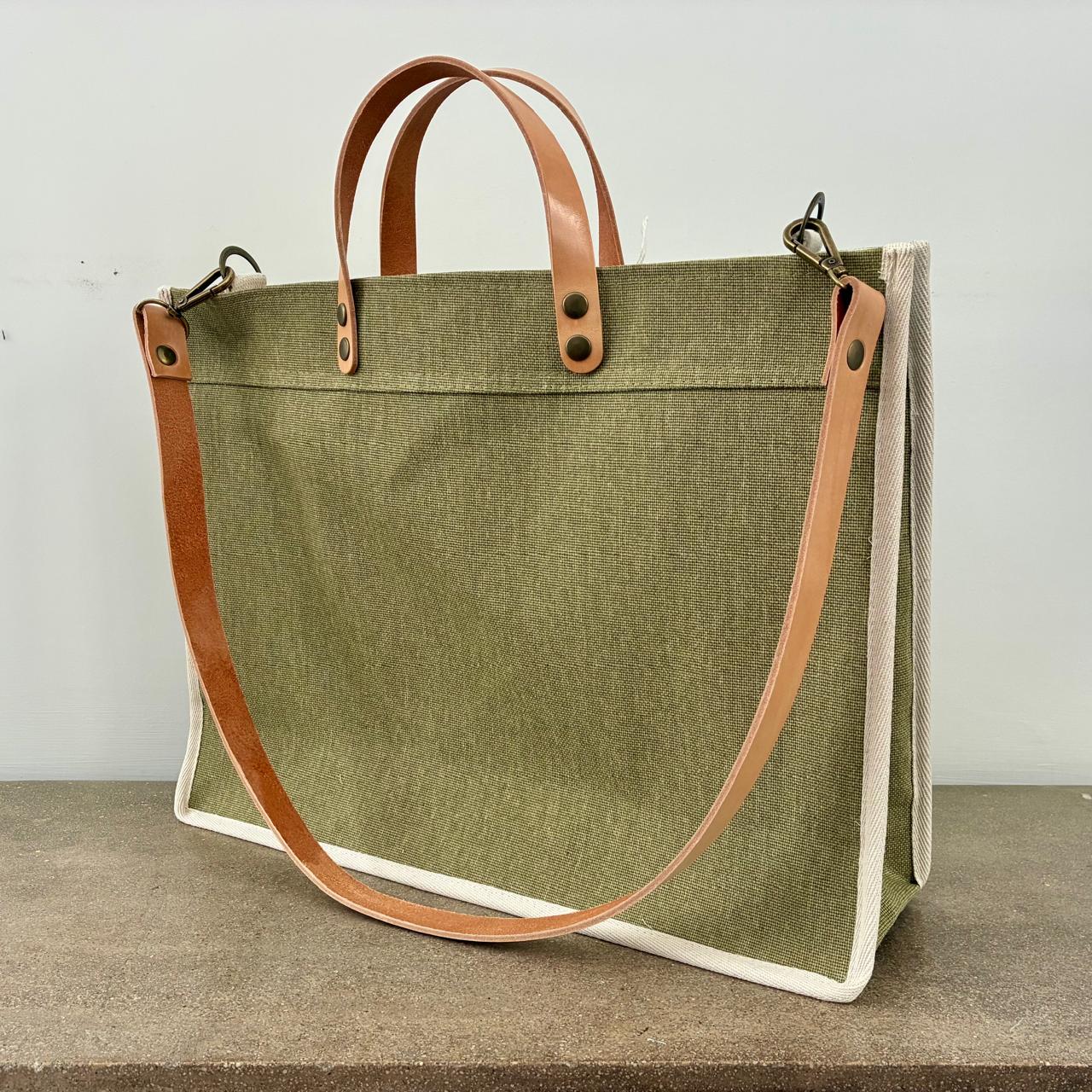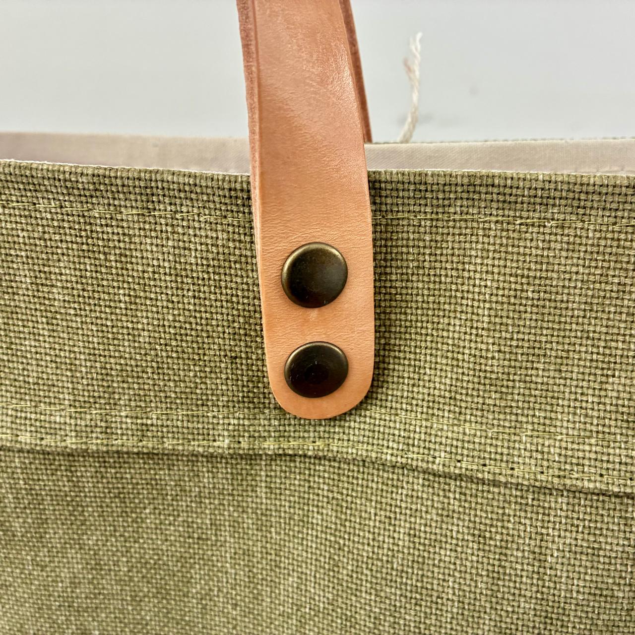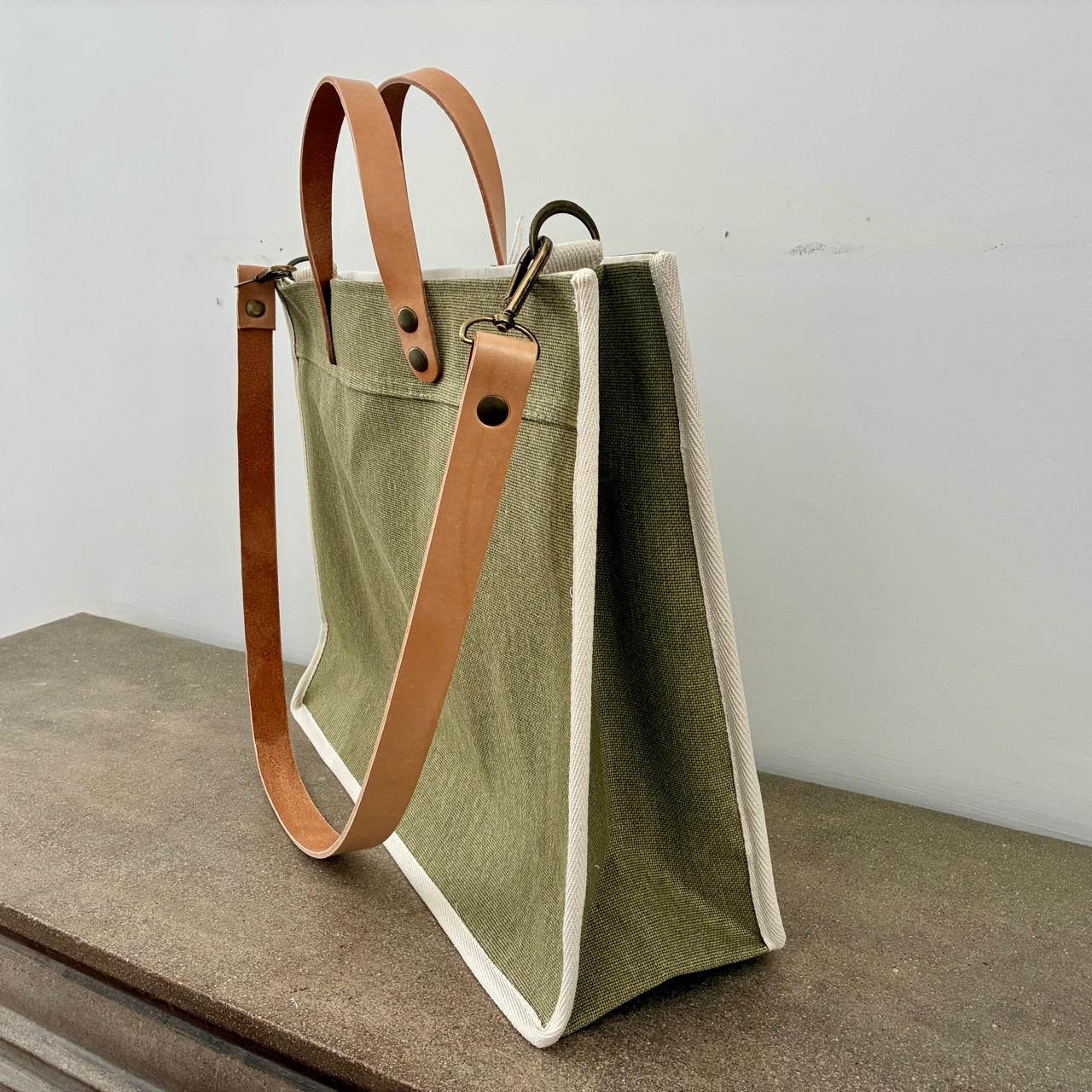 Tote confeccionada en lona natural con forrería en lienzo 100% algodón. Combina materiales nobles y detalles de calidad.